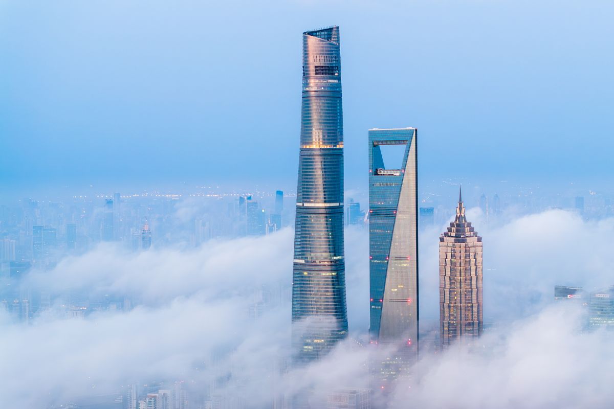 Der Shanghai Tower im Finanzdistrikt Pudong ist mit 632 Metern das dritthöchste Gebäude der Welt. Seit 2015 überragt es den Jin Mao Tower und das Shanghai World Financial Center. Der Turm besteht aus neun verdrehten Segmenten, die durch eine Glasfassade geschützt sind, und reduziert dank seiner Spiralform die Windbelastung. Die transparente Hülle des Gebäudes spart zudem Energie. Neben Büros, Geschäften und einem Hotel gibt es in jeder der neun Zonen eine Skylobby und ein Gartenatrium. Mit den schnellsten Aufzügen der Welt, die 18 Meter pro Sekunde erreichen, können Besucher rasch die obersten Etagen erreichen.