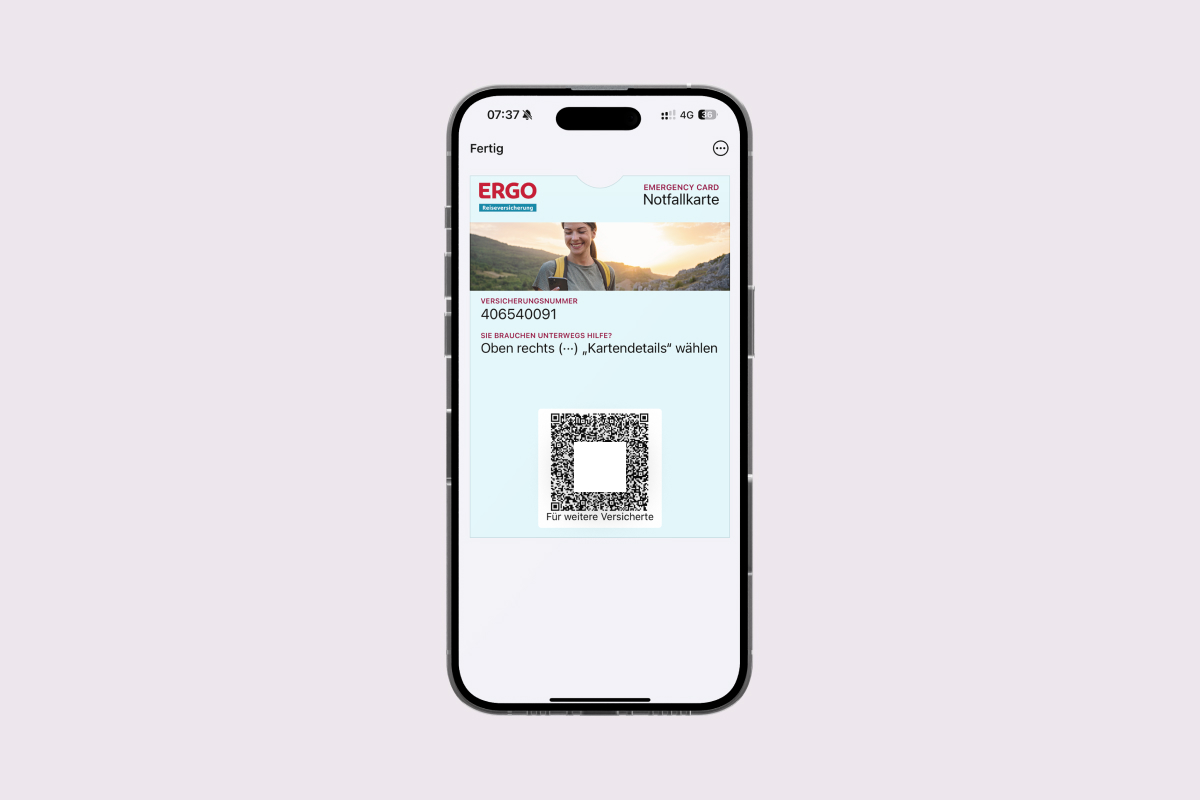 Haben Sie eine Auslandskrankenversicherung oder den RundumSorglos-Schutz bei der ERGO Reiseversicherung abgeschlossen? Wenn Sie Ihre Flug- oder Bahntickets auf Ihrem Smartphone speichern, warum dann nicht auch Ihre Versicherungsunterlagen? Mit der digitalen Notfallkarte gehört Papierkram der Vergangenheit an. Die Versicherungskarte speichert alle wichtigen Informationen bequem auf Ihrem Handy.