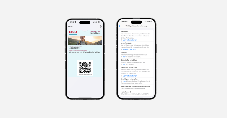 Der Einführung der digitalen Notfallkarte ging ein Pilotprojekt der ERV in Zusammenarbeit mit Miss Moneypenny Technologies voraus, das von Juli bis August 2023 stattfand. In diesem Zeitraum erhielten über 20.000 Reisekrankversicherungs-Kunden der ERV per E-Mail das Angebot, die Karte in ihre Wallet zu laden. Aufgrund der vielen positiven Rückmeldungen und der hohen Nachfrage nach diesem Service ist das Projekt nun in die nächste Phase gestartet: die Einführung der digitalen Notfallkarte mit zusätzlichen Funktionen für alle Reisekranken-Versicherungskunden der ERV. Bestandskunden, die noch die physische beziehungsweise Vorgängerversion der digitalen Notfallkarte besitzen, werden sukzessive mit dem Angebot kontaktiert. Sie können aber im Bedarfsfall auch jetzt schon jederzeit den Link zur aktuellen Version anfordern.